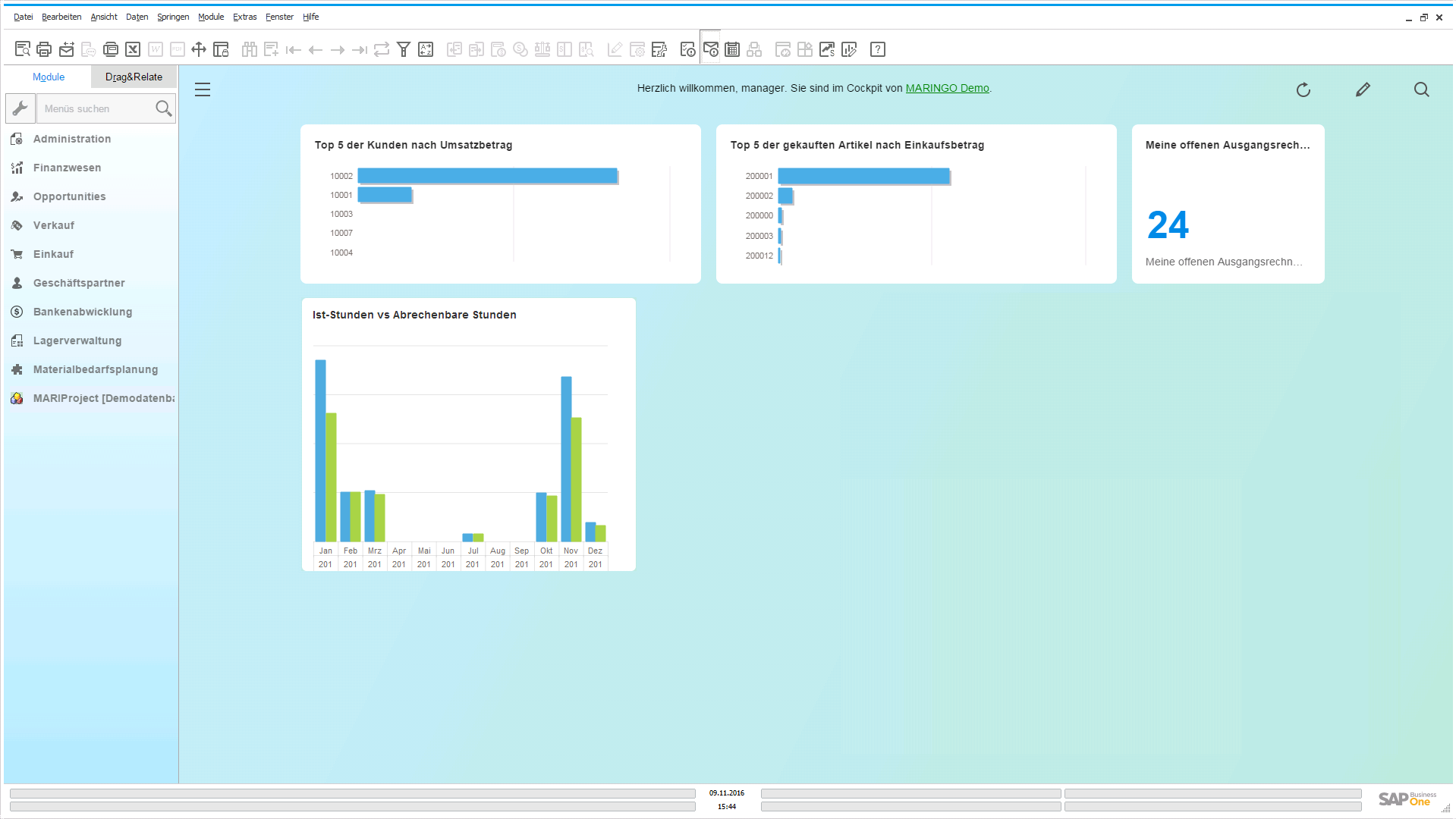 Mit der Einführung von SAP Business One mit der integrierten Projektmanagementlösung von MARINGO (MARIProject) arbeiten nun alle Mitarbeiter mit einer Unternehmenslösung und greifen auf dieselbe Datenbasis zu. Somit unterstützt SAP Business One kleine und mittelständische Unternehmen dabei, im hektischen Tagesgeschäft die Übersicht zu behalten. Sowohl die operativen Mitarbeiter – wie beispielsweise Consultants, Techniker, Ingenieure und Projektleiter, als auch das Management können folgende Fragen kurzfristig und tagesaktuell auf Knopfdruck beantworten: