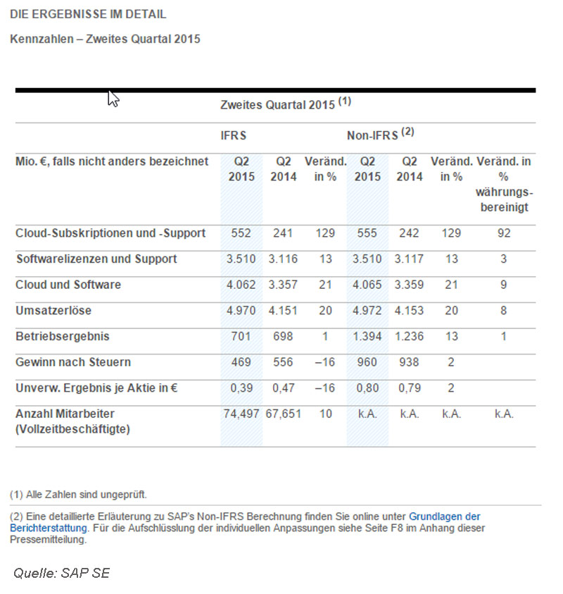 Die Ergebnisse für das zweite Quartal 2015 und das erste Halbjahr wurden von der SAP SE veröffentlicht.