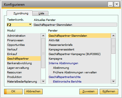 Beispiel: F2 zu Geschäftspartner-Stammdaten. Wenn Sie das nächste Mal F2 drücken, öffnet sich das Fenster “Geschäftspartner-Stammdaten”.