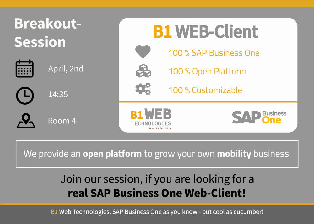 Am 2. April, Zimmer 4 um 14:35 findet die Präsentation des B1 WEB-Client statt. Die B1 Web-Technologie bietet eine Alternative zum Frontend des Fat-Client von SAP Business One.