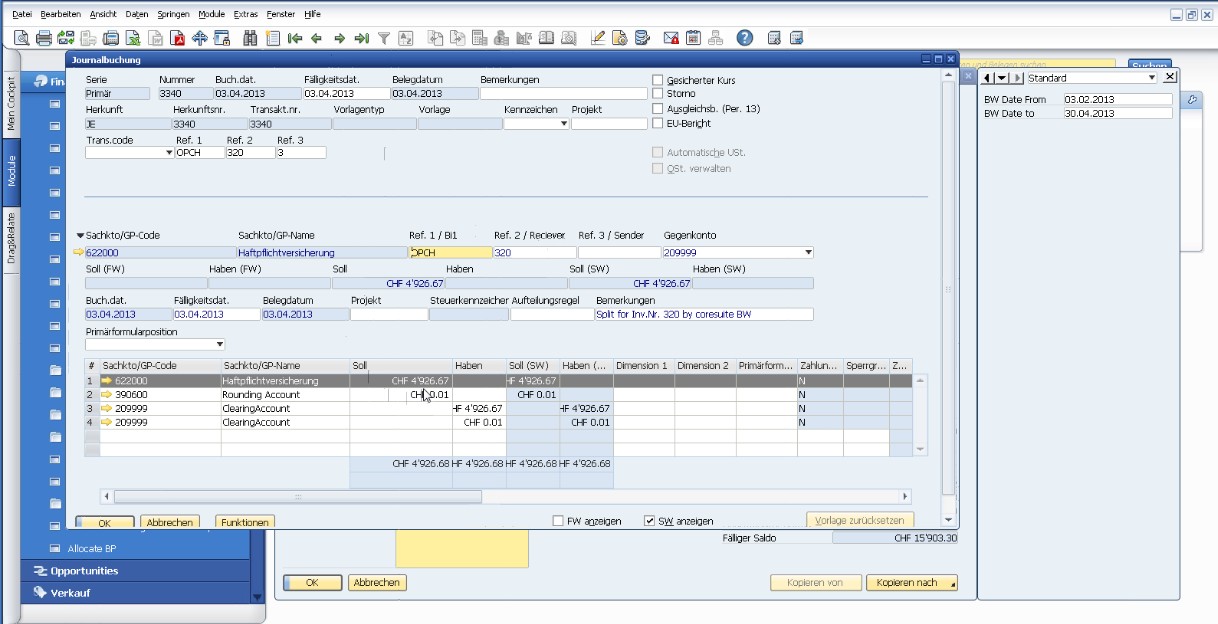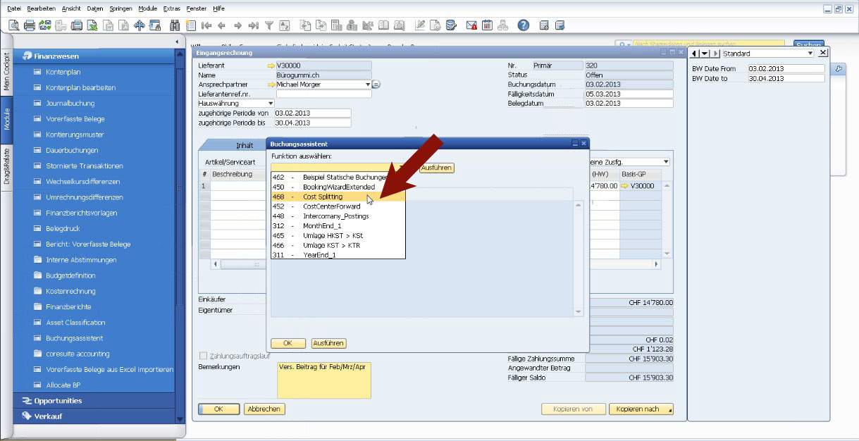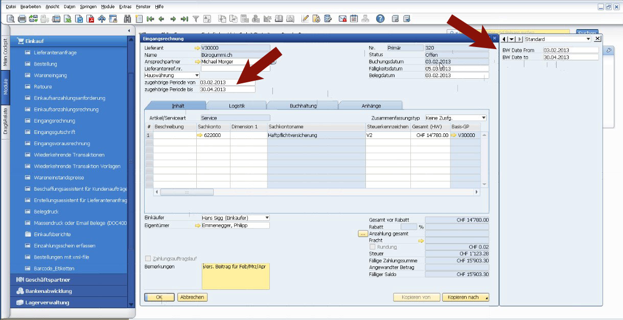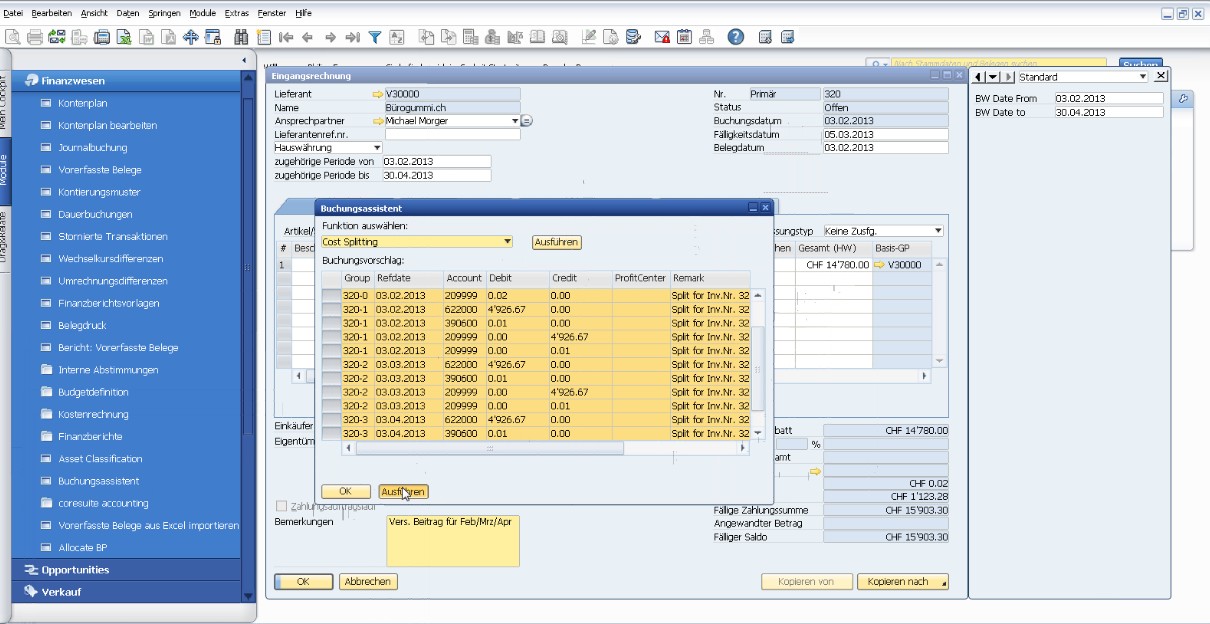 Am Jahresanfang geht beispielsweise eine Versicherungs-Eingangs-Rechnung ein – die einen Jahresgesamt-Betrag ausweist. Diese Summe muss allerdings auf alle 12 Monate verteilt werden. Im Standard ist lediglich die Buchung des Gesamtbetrags in die Buchungsperiode Monat Januar möglich und die zeitliche Zuordnung im Januar des Buchungsjahres. Durch die äußerst nützliche Erweiterung von coresuite ist es nunmehr möglich diesen Gesamtbetrag auf mehrere Teilperioden (Monate) zu verteilen, das bedeutet gesplittet in 12 Teile auf das komplette Kalenderjahr.