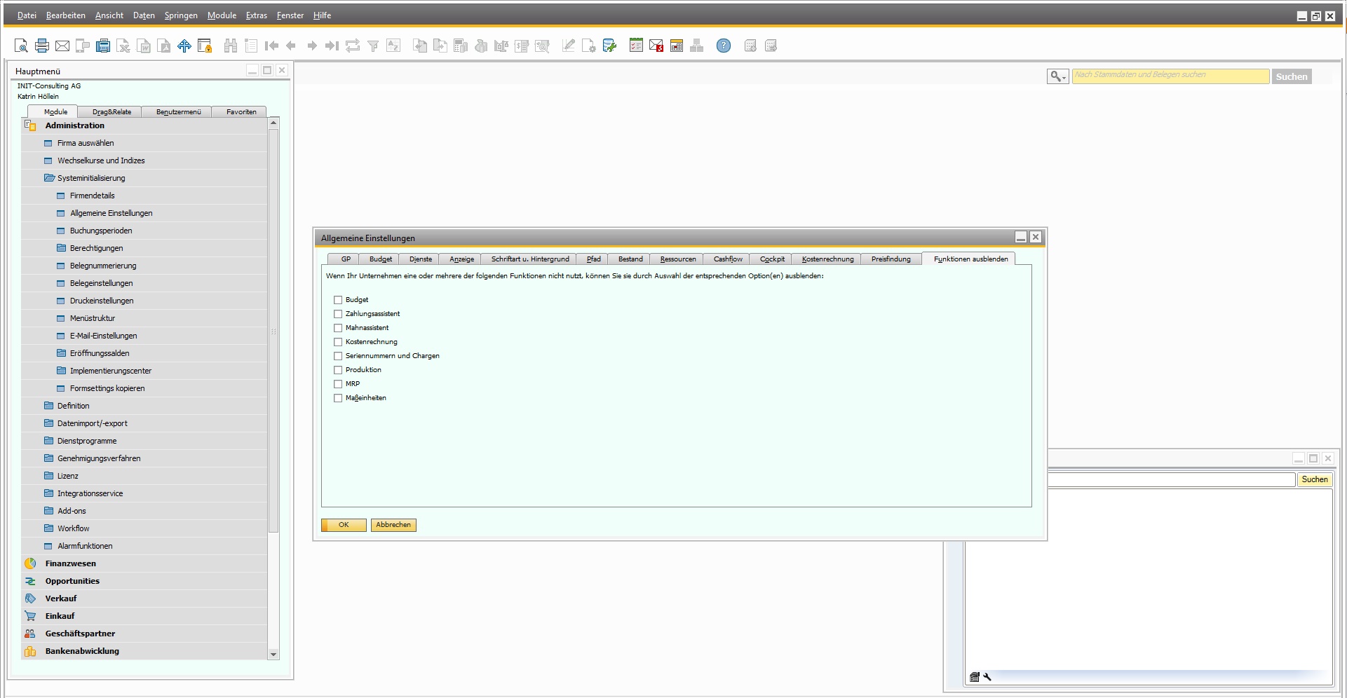 Funktionen in SAP Business One ausblenden