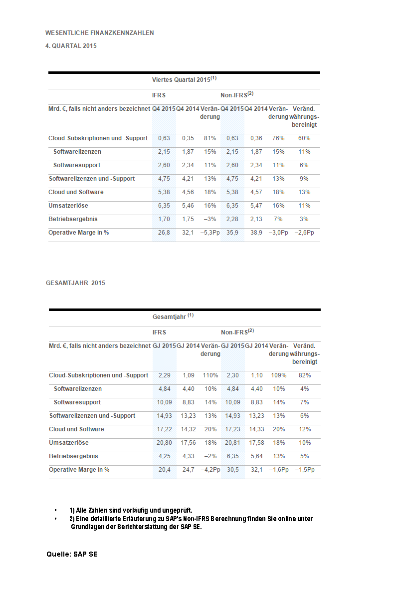 Die SAP SE in Walldorf hat die vorläufigen Ergebnisse für das vierte Quartal sowie das Gesamtjahr 2015 veröffentlicht. Alle Zahlen für 2015 in dieser Mitteilung sind Näherungswerte, da diese Veröffentlichung vorläufige Zahlen beinhaltet.