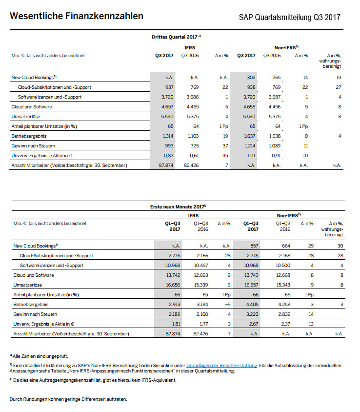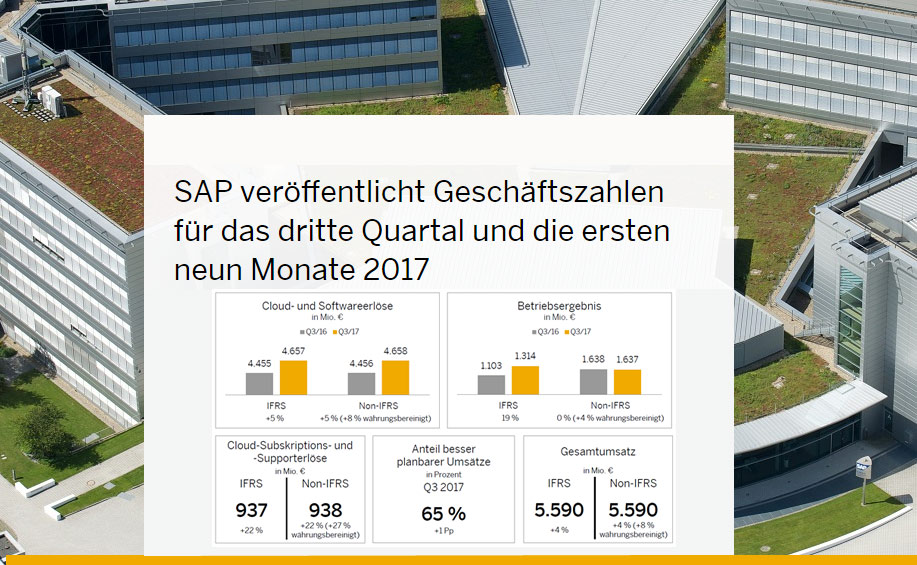 Die SAP SE hat die Zahlen für das dritte Quartal und die ersten neun Monate von 2017 veröffentlicht. Hervorragende Softwareerlöse und Wachstum in allen Geschäftsaktivitäten: