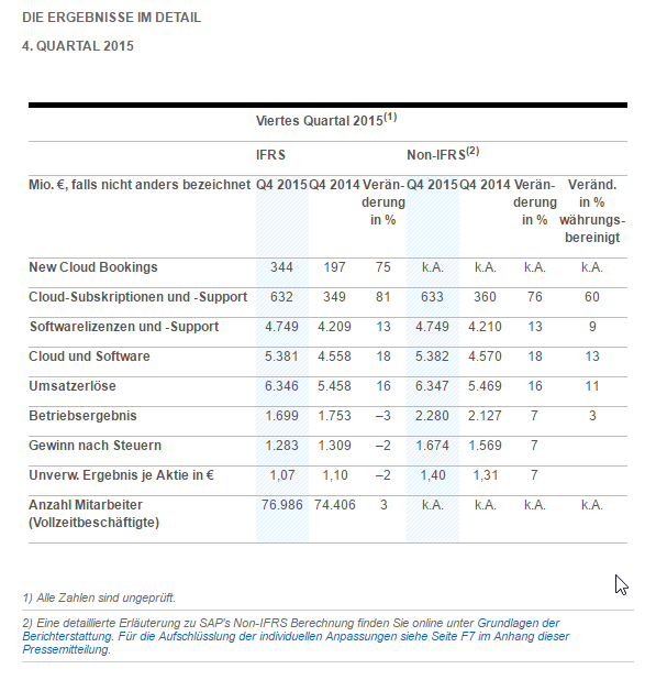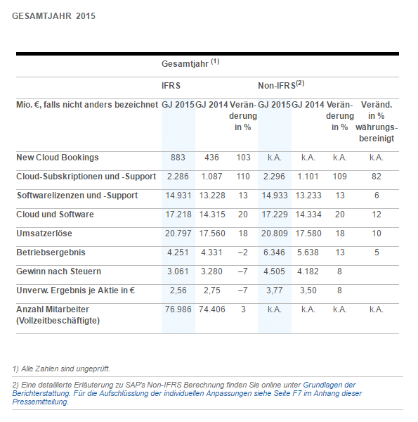 Die SAP SE hat die vorläufigen Geschäftszahlen für das vierte Quartal und das Gesamtjahr 2015 veröffentlicht: